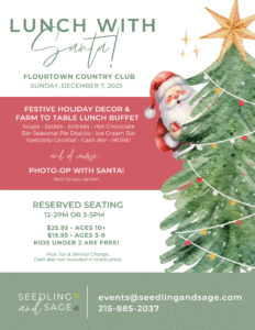 Join Seedling & Sage for Lunch with Santa at Flourtown Country Club. Enjoy Festive Holiday Decor, Farm to Table Lunch Buffet, and a Photo-op with Santa!